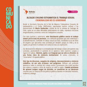 Criminalizar no es gobernar. RedTraSex y Fundación Margen rechazamos las declaraciones de Mario Desbordes en Santiago de Chile La RedTraSex (Red de Trabajadoras Sexuales de América Latina y el Caribe)